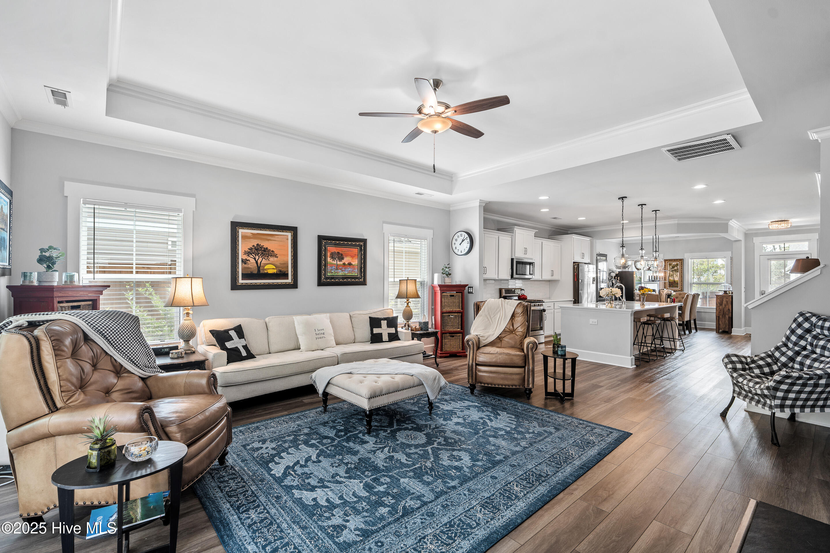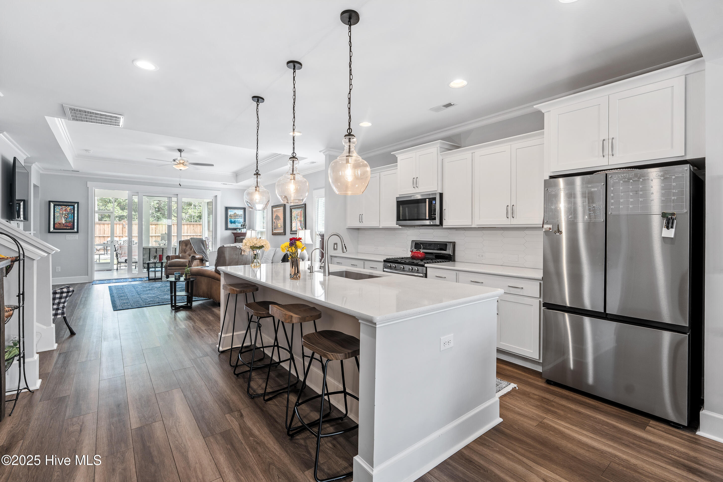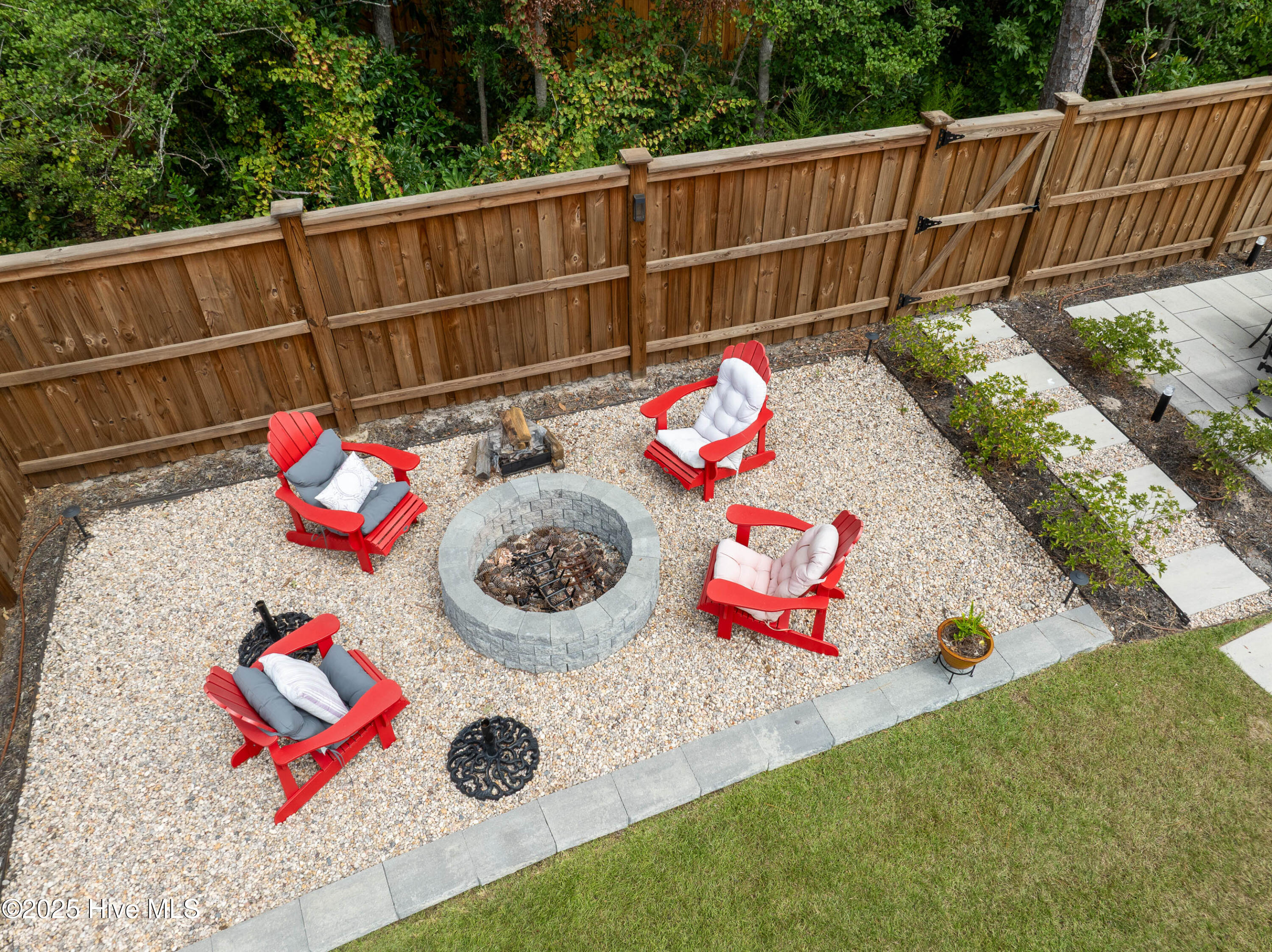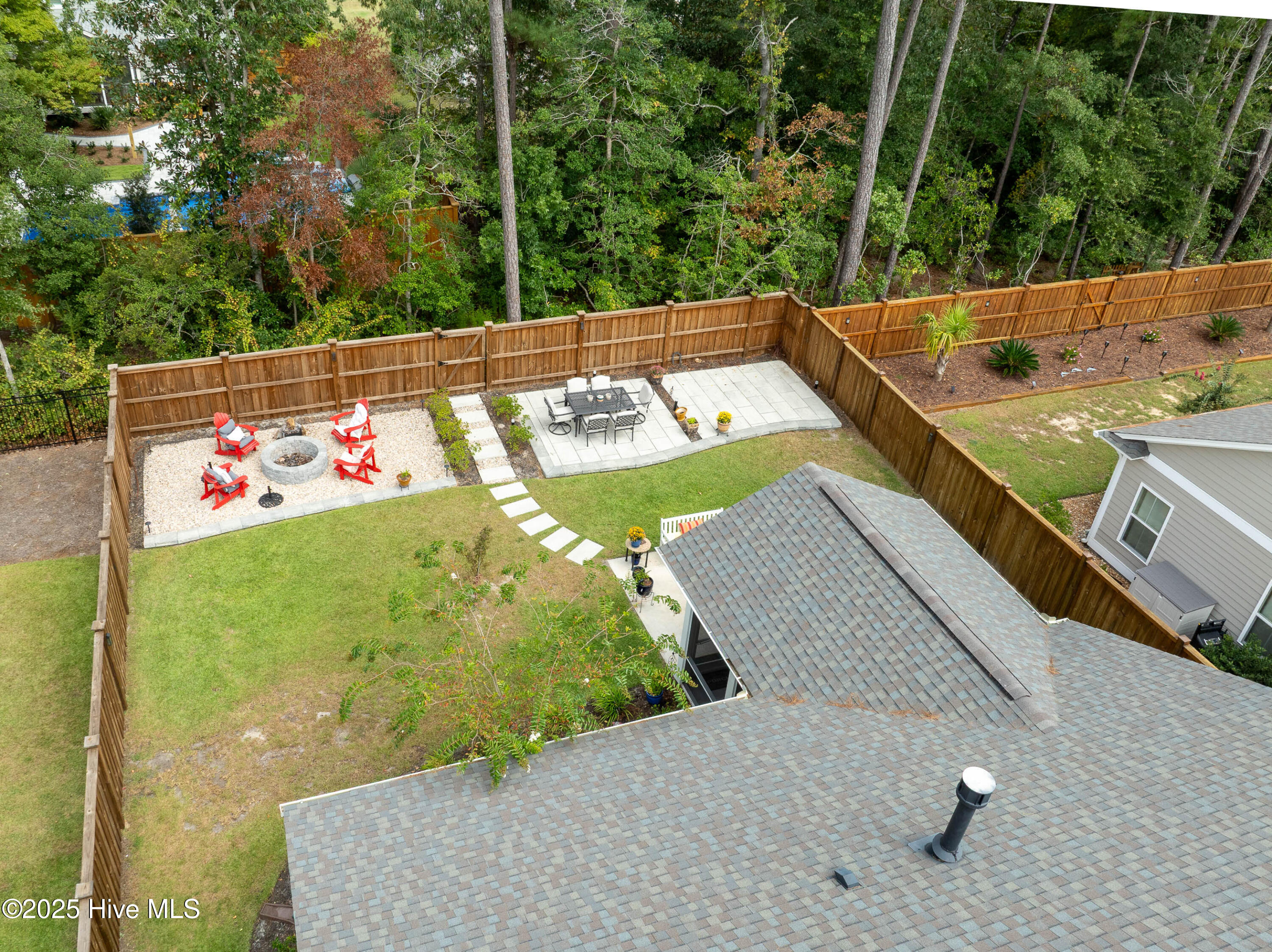 This stunning Everett floor plan offers 4 bedrooms, 2.5 bathrooms, and a desirable first-floor master suite. The home's exterior shines with Hardie Board siding and a charming coastal-style elevation. Step inside to an open-concept layout filled with natural light. The chef's kitchen is a showstopper with quartz countertops, a large island, custom cabinetry, stylish tile backsplash, gas stove, pantry, and high-end KitchenAid appliances. A semi-formal dining area flows into the spacious living room, featuring vaulted ceilings, custom lighting, and a gas fireplace. The luxurious master suite boasts dual Stricklands-designed walk-in closets and a spa-like bath with custom tile, cabinetry, oversized shower, and a private water closet. The master bath conveniently connects to a wraparound laundry room with upgraded cabinetry and lighting. Upstairs, enjoy a versatile bonus room, three additional bedrooms, and a full bath with double vanity. Perfect for entertaining, this home includes Telescoping Florida Doors leading to a screened-in porch, additional patios, a custom firepit, ambient lighting, and a private fenced yard. Community amenities include a pool, gazebo, and grilling area--all in the desirable Porter's Neck area of Wilmington.