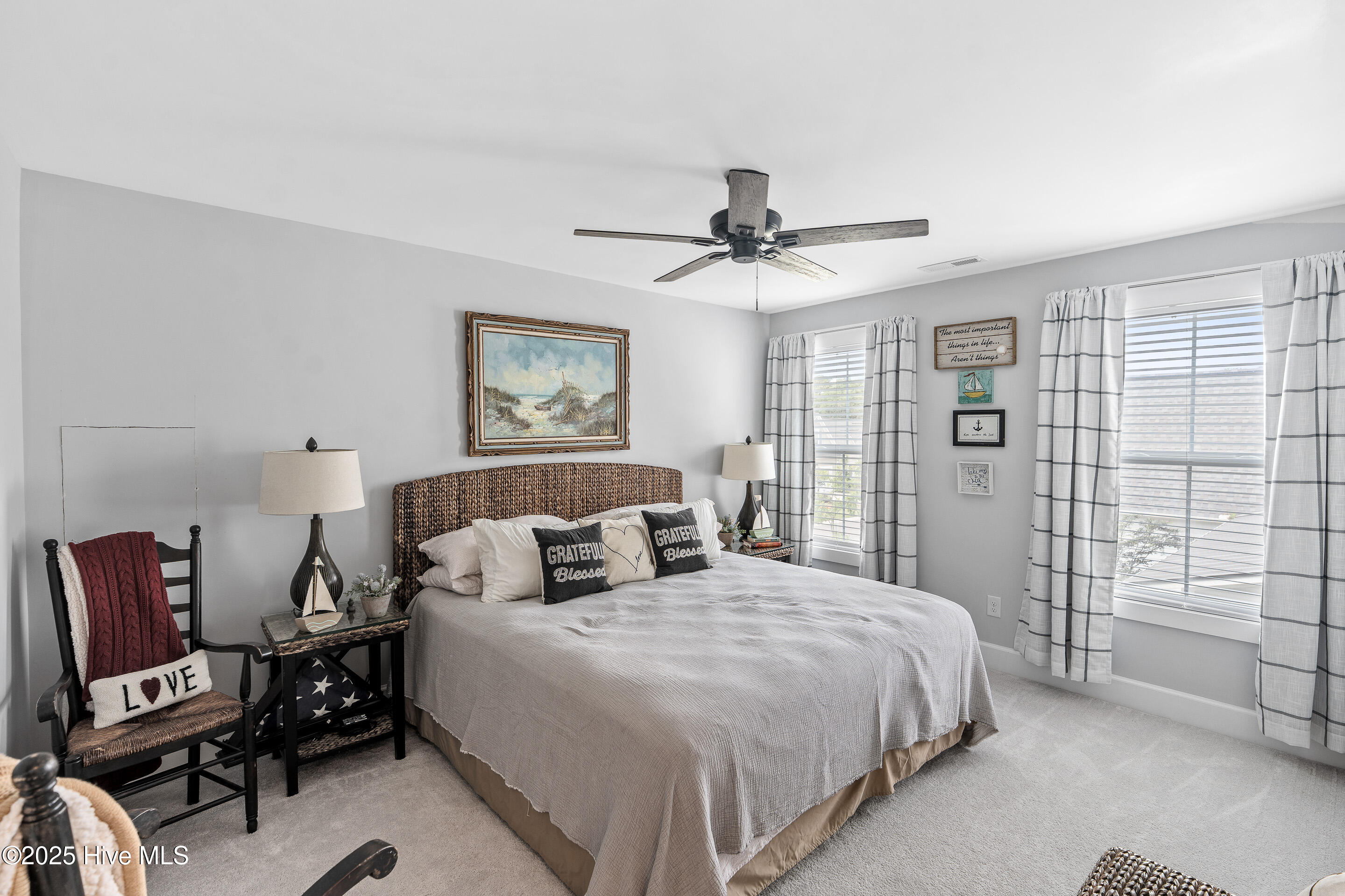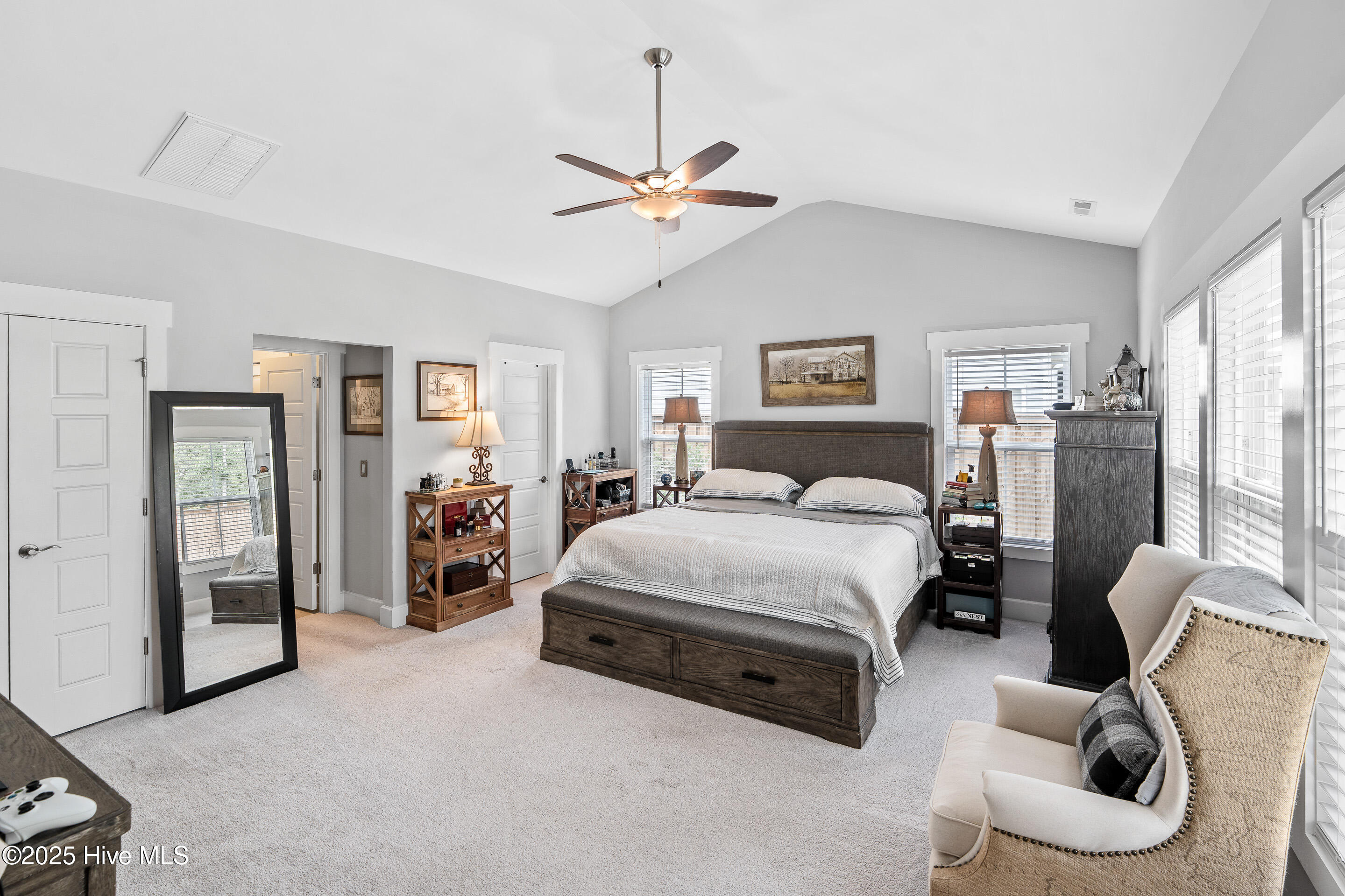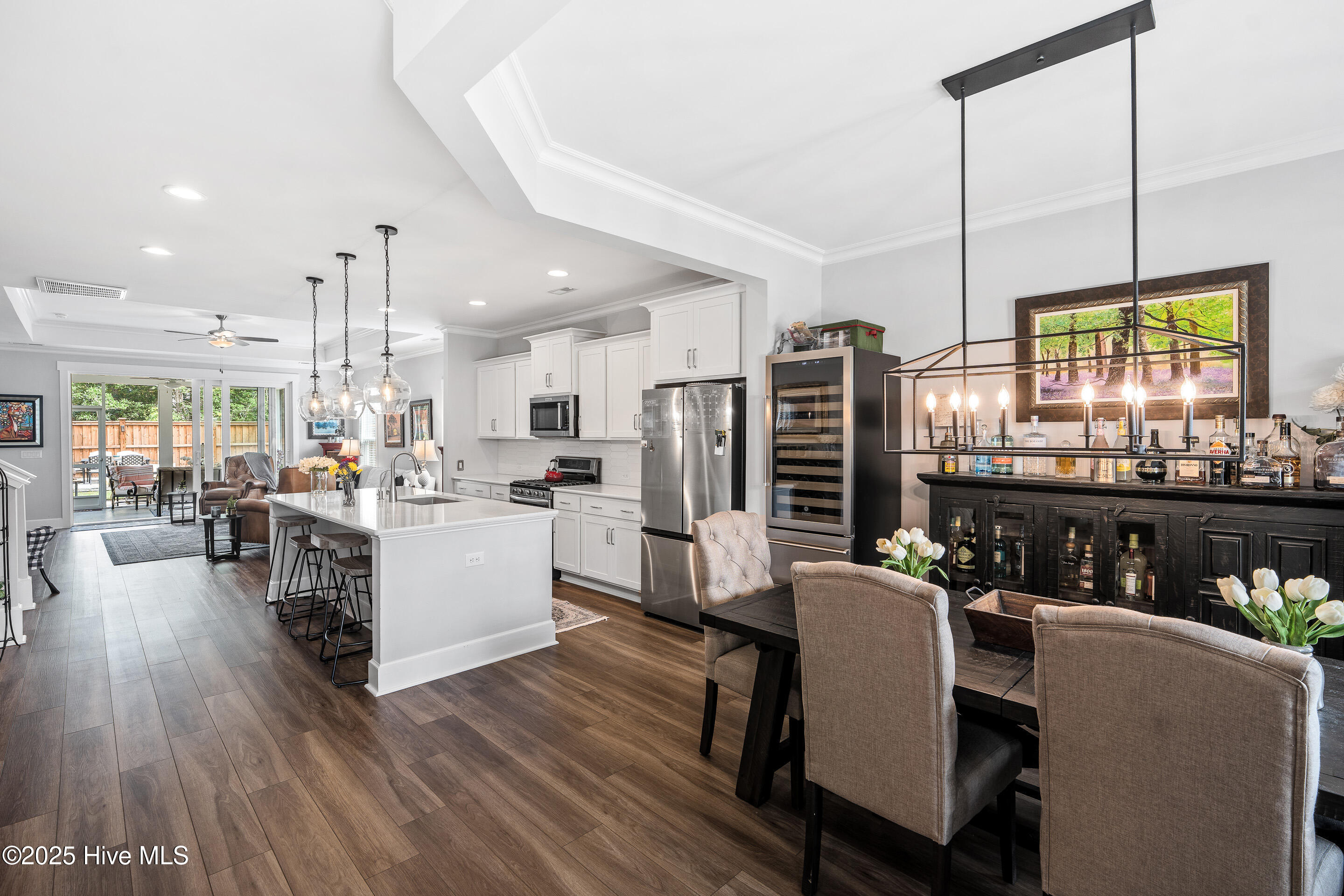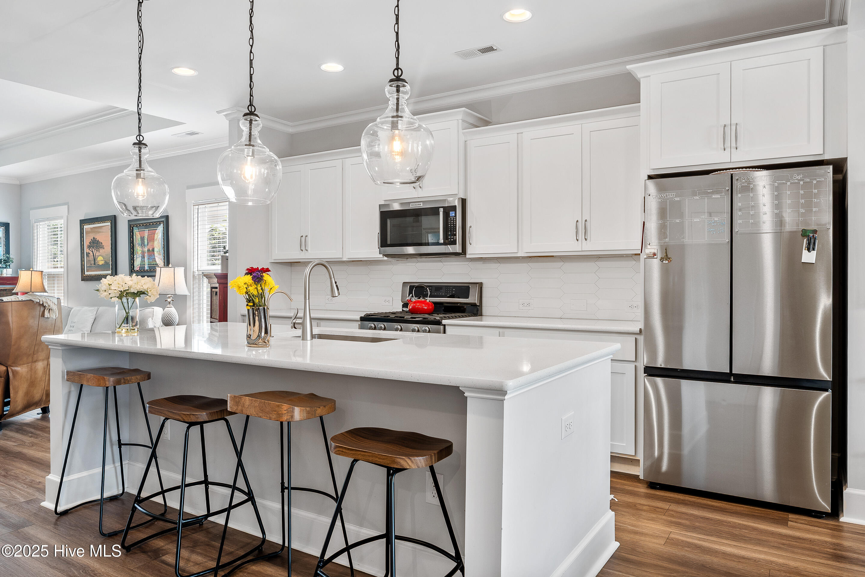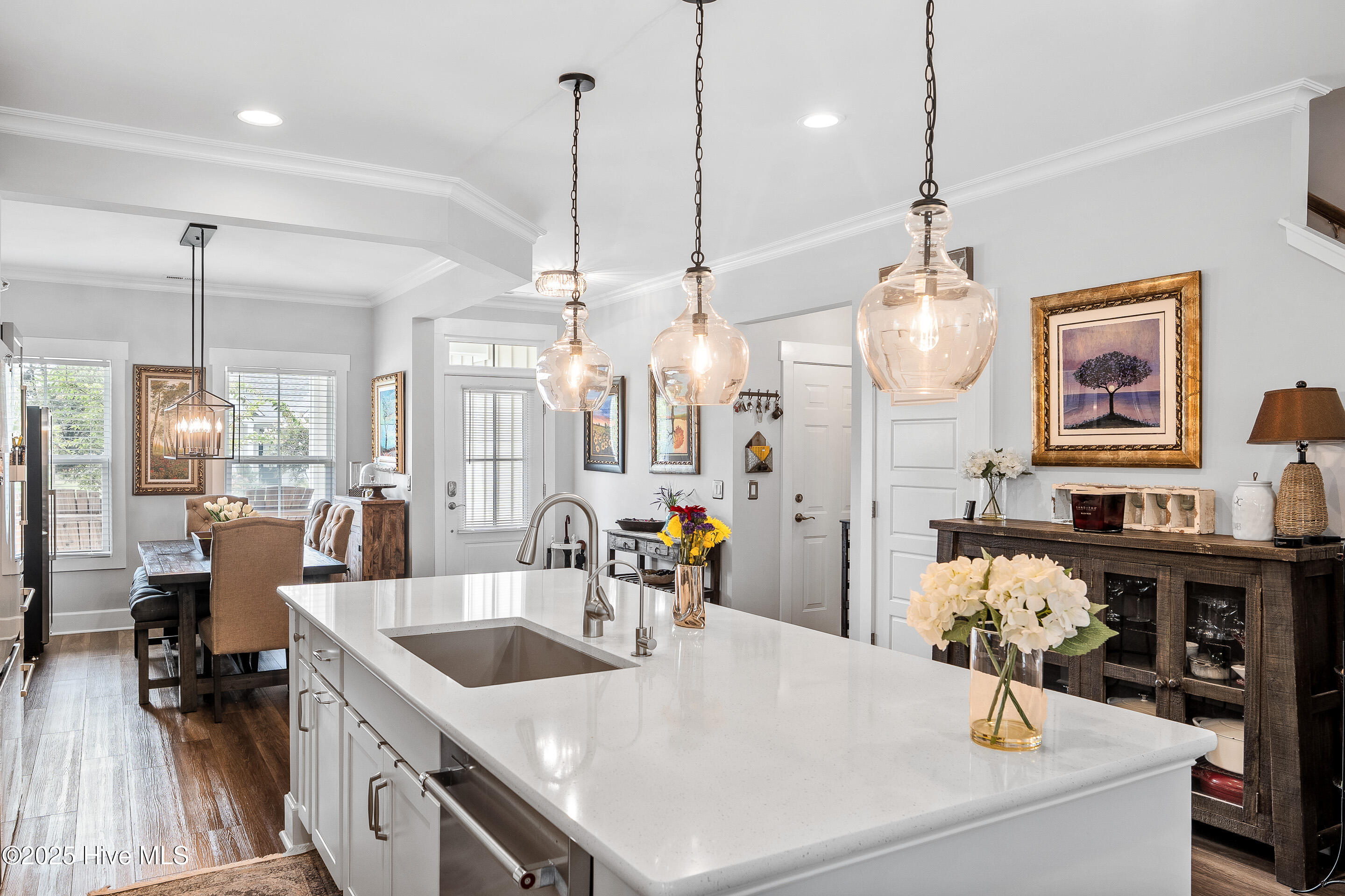 This stunning Everett floor plan offers 4 bedrooms, 2.5 bathrooms, and a desirable first-floor master suite. The home's exterior shines with Hardie Board siding and a charming coastal-style elevation. Step inside to an open-concept layout filled with natural light. The chef's kitchen is a showstopper with quartz countertops, a large island, custom cabinetry, stylish tile backsplash, gas stove, pantry, and high-end KitchenAid appliances. A semi-formal dining area flows into the spacious living room, featuring vaulted ceilings, custom lighting, and a gas fireplace. The luxurious master suite boasts dual Stricklands-designed walk-in closets and a spa-like bath with custom tile, cabinetry, oversized shower, and a private water closet. The master bath conveniently connects to a wraparound laundry room with upgraded cabinetry and lighting. Upstairs, enjoy a versatile bonus room, three additional bedrooms, and a full bath with double vanity. Perfect for entertaining, this home includes Telescoping Florida Doors leading to a screened-in porch, additional patios, a custom firepit, ambient lighting, and a private fenced yard. Community amenities include a pool, gazebo, and grilling area--all in the desirable Porter's Neck area of Wilmington.