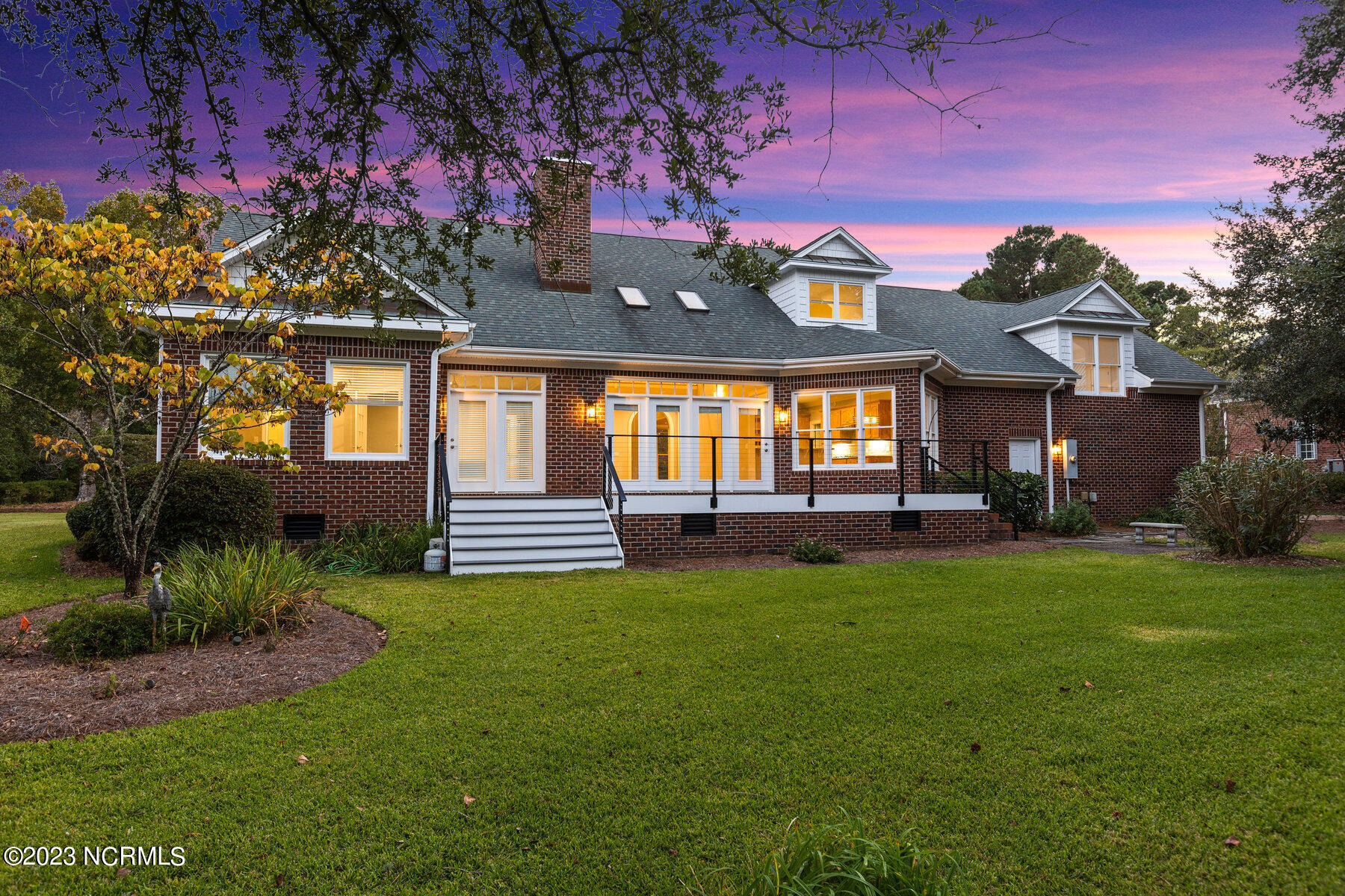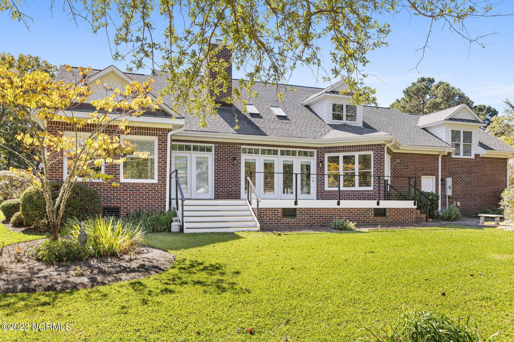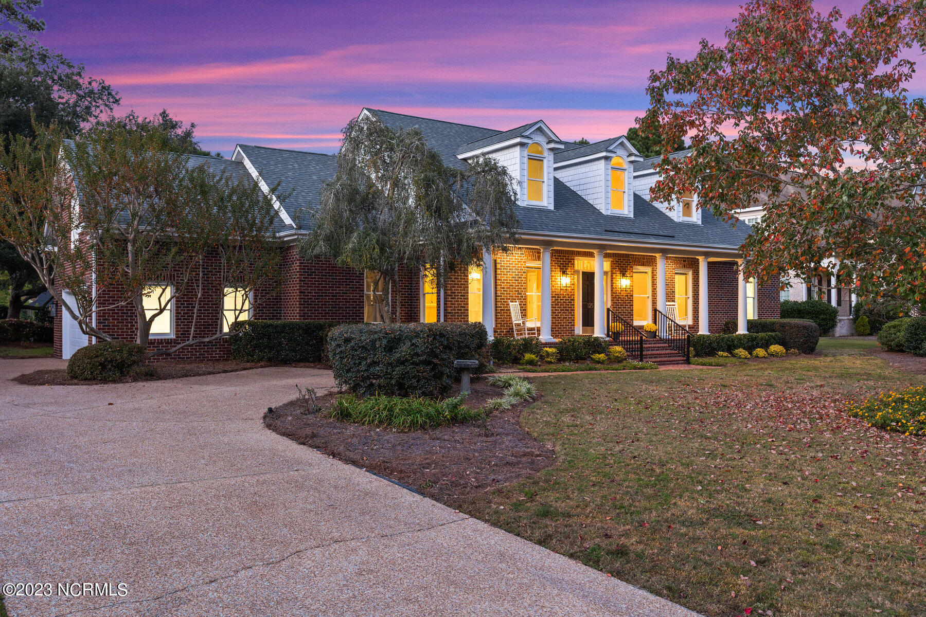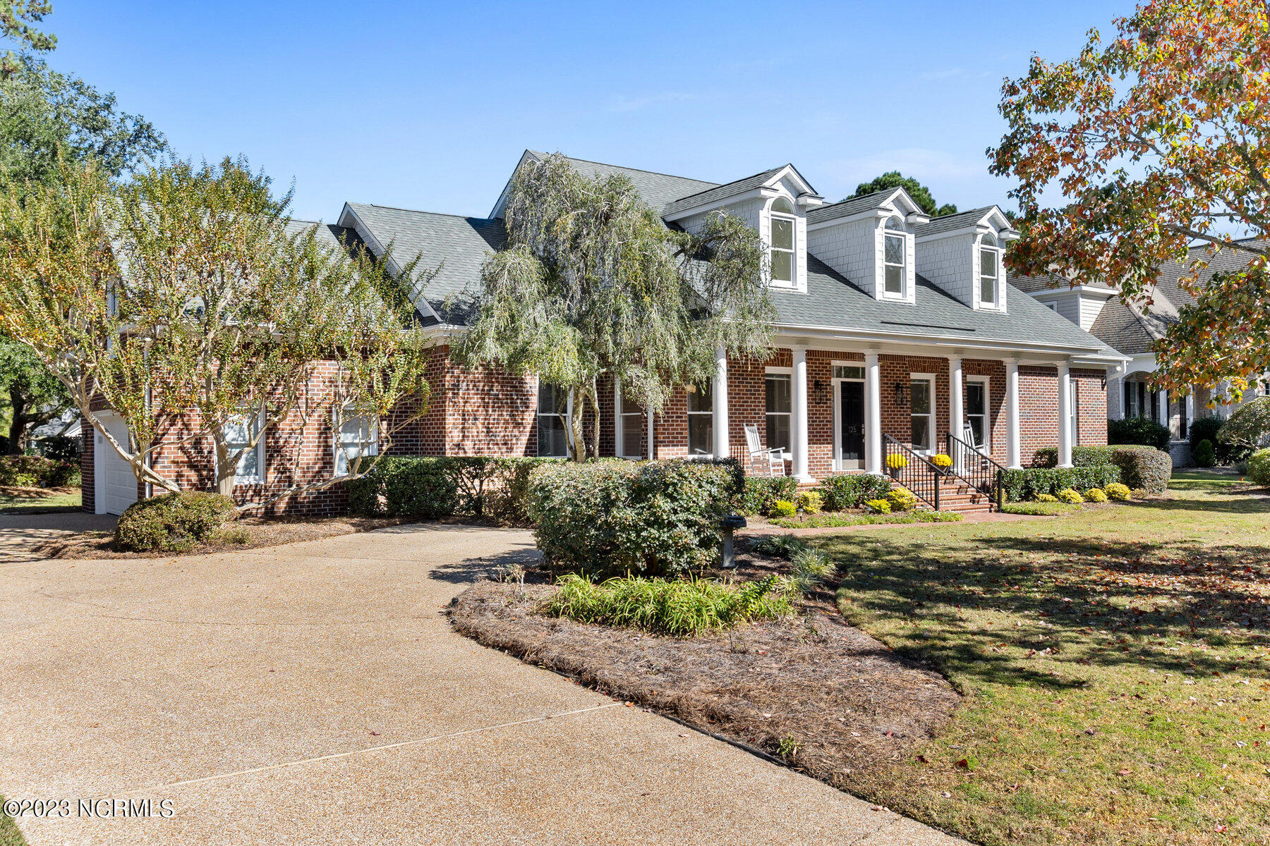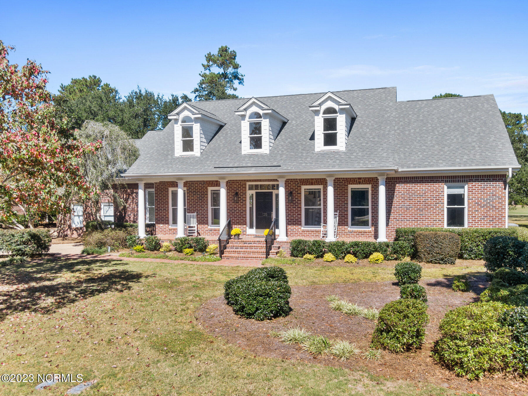 Explore the timeless charm of 125 Hallbrook Farms Circle--a delightful 4-bedroom, 4-bath brick Cape Cod residence nestled on a quiet street, offering captivating golf views of the 5th fairway. This elegant home seamlessly combines classic sophistication with modern convenience. As you step inside you'll discover a meticulously designed interior featuring spacious rooms and top-of-the-line finishes. The elegant moldings and beautiful Oak flooring flow into a sunlit two-story great room with skylights and a cozy gas logs fireplace. The kitchen is complete with custom cabinetry, granite countertops, and quality stainless appliances, and flows into a sunny breakfast room that's ideal for get-togethers. The luxurious master suite offers a spa-like bath, while an en suite office provides an inviting space to work or relax. The private bonus room with a separate staircase is the perfect getaway for a man cave, playroom, or office. The second level is complete with two beds and two full baths. Enjoy leisurely evenings on the sprawling front porch or take in the golf views on the back deck. Recent updates include a new roof, HVAC, water heater, fresh paint, new carpet, new deck, and railing. The appeal of this gated community is that residents have access to the boat ramp and picnic area on the Intracoastal Waterway. Membership to the top-rated Porters Neck Country Club is available and amenities include golf, tennis, fitness, dining, pool, and pickleball. Experience the perfect blend of classic beauty and modern comfort at 125 Hallbrook Farms, your private paradise on the greens.