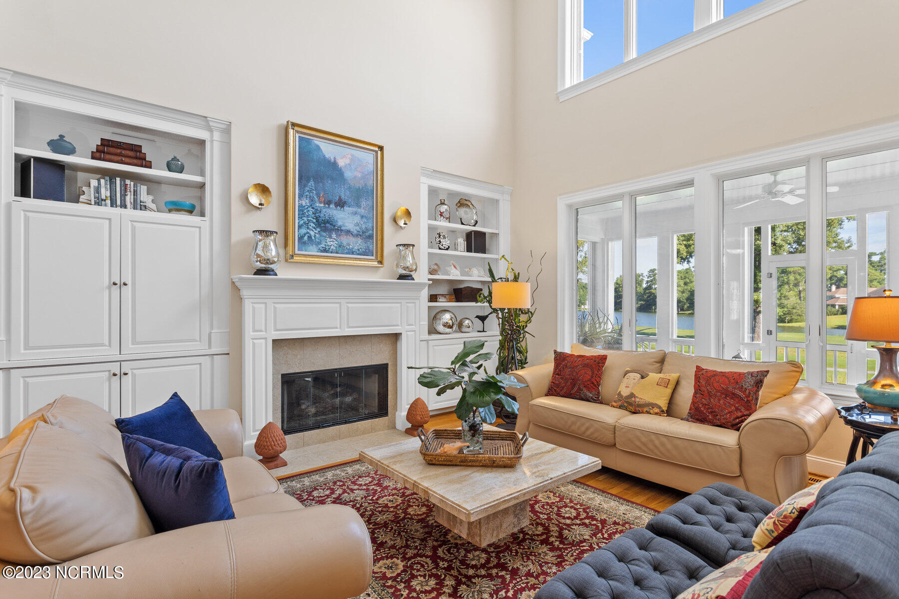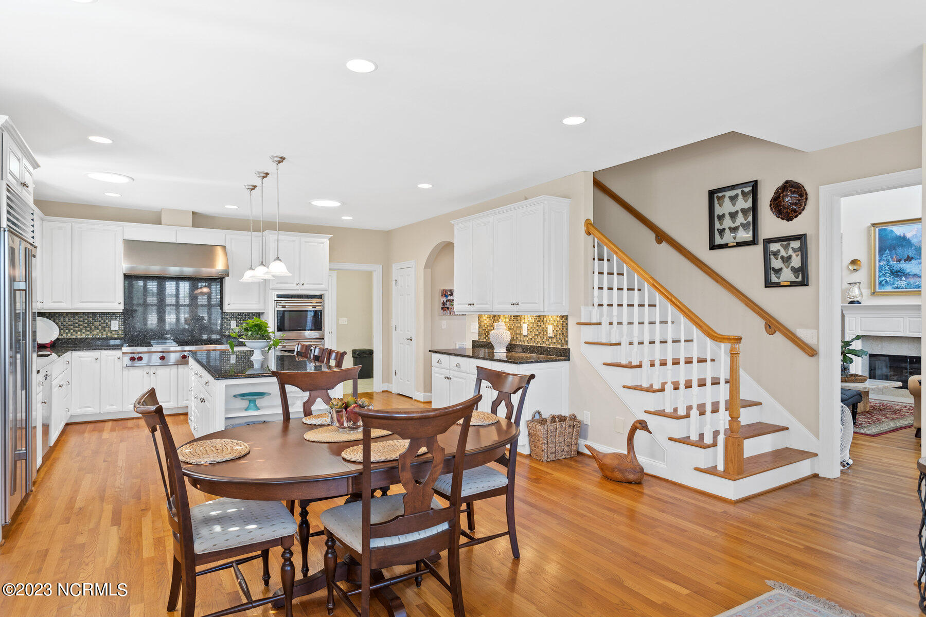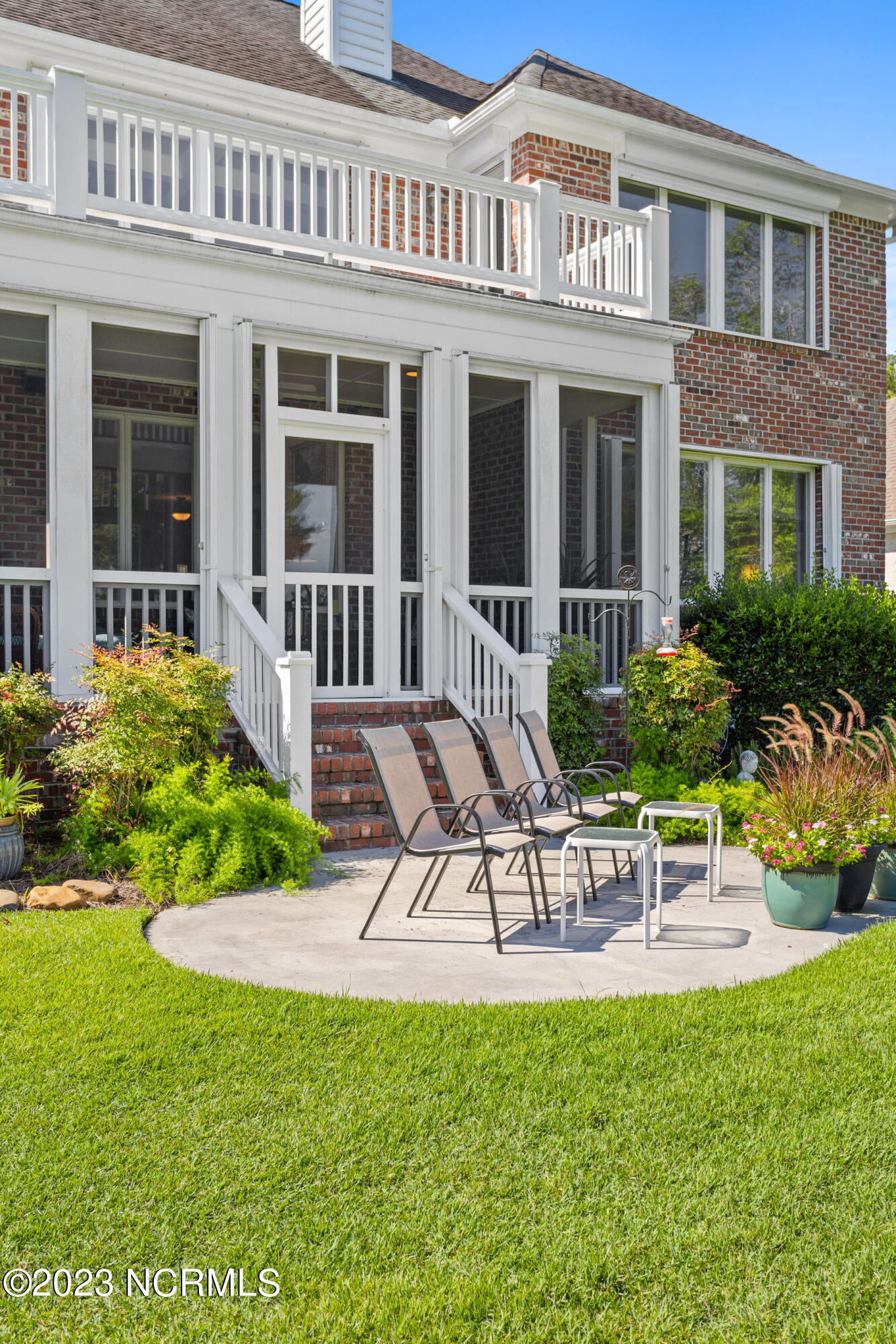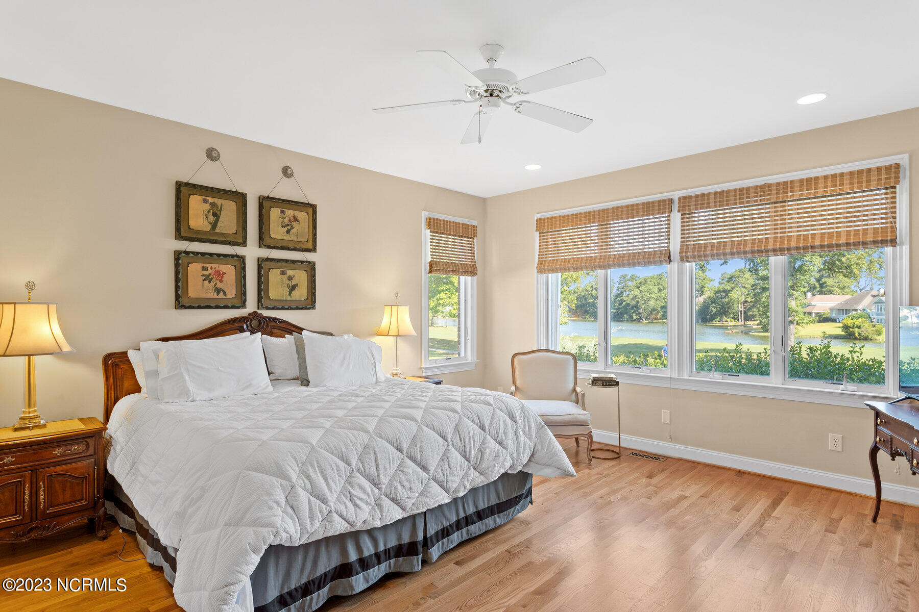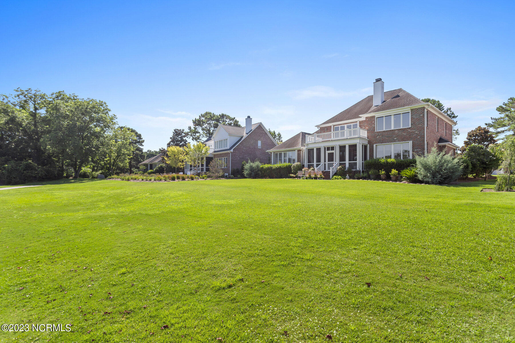 Welcome home to 8940 Woodcreek Circle--a charming four-bedroom, three-and-a-half-bath brick home overlooking the 14th green of Porters Neck Country Club with stunning views of Lake Nona. Upon entering the double doors your eyes will be drawn to the expansive water and golf views as you settle into the two-story living room complete with built-ins around the fireplace. Moving around the corner leads you to a butler's pantry and then into the gourmet chef's kitchen complete with top-of-the-line appliances including the centerpiece Wolf 6-burner gas range, double ovens with convection, Sub-Zero refrigerator and Miele dishwasher anchored by an oversized island with granite tops. The kitchen and additional sitting area both have spectacular golf course views. Step out onto your private screened porch to unwind after a long day and enjoy the sunset. The first-level master suite is complete with a walk-in closet, walk-in shower, and jetted tub. Finishing off the first level is a formal dining room, powder room, and expansive laundry room. Upstairs boasts three bedrooms and two bathrooms and a large walk-in attic space for easy storage. The fourth bedroom with en suite bath also has a private balcony with arguably the best vantage point for water views.